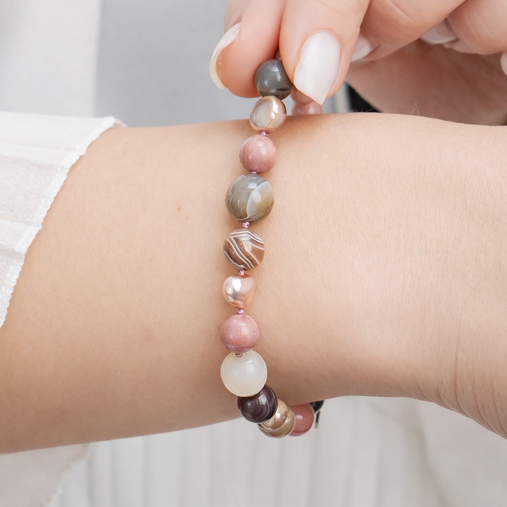 Браслет с жемчугом, агатом и родолитами