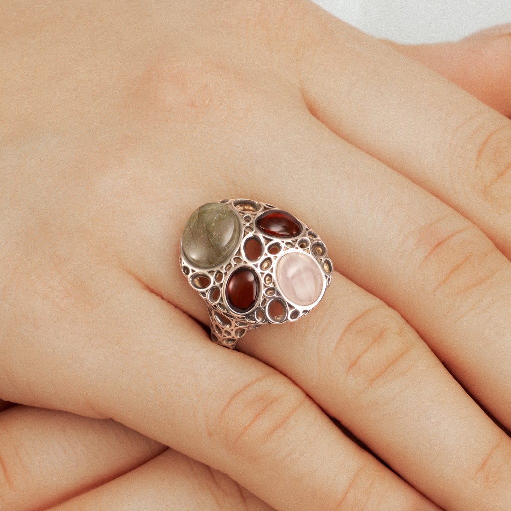 Серебряное кольцо с янтарем и лабрадоритом